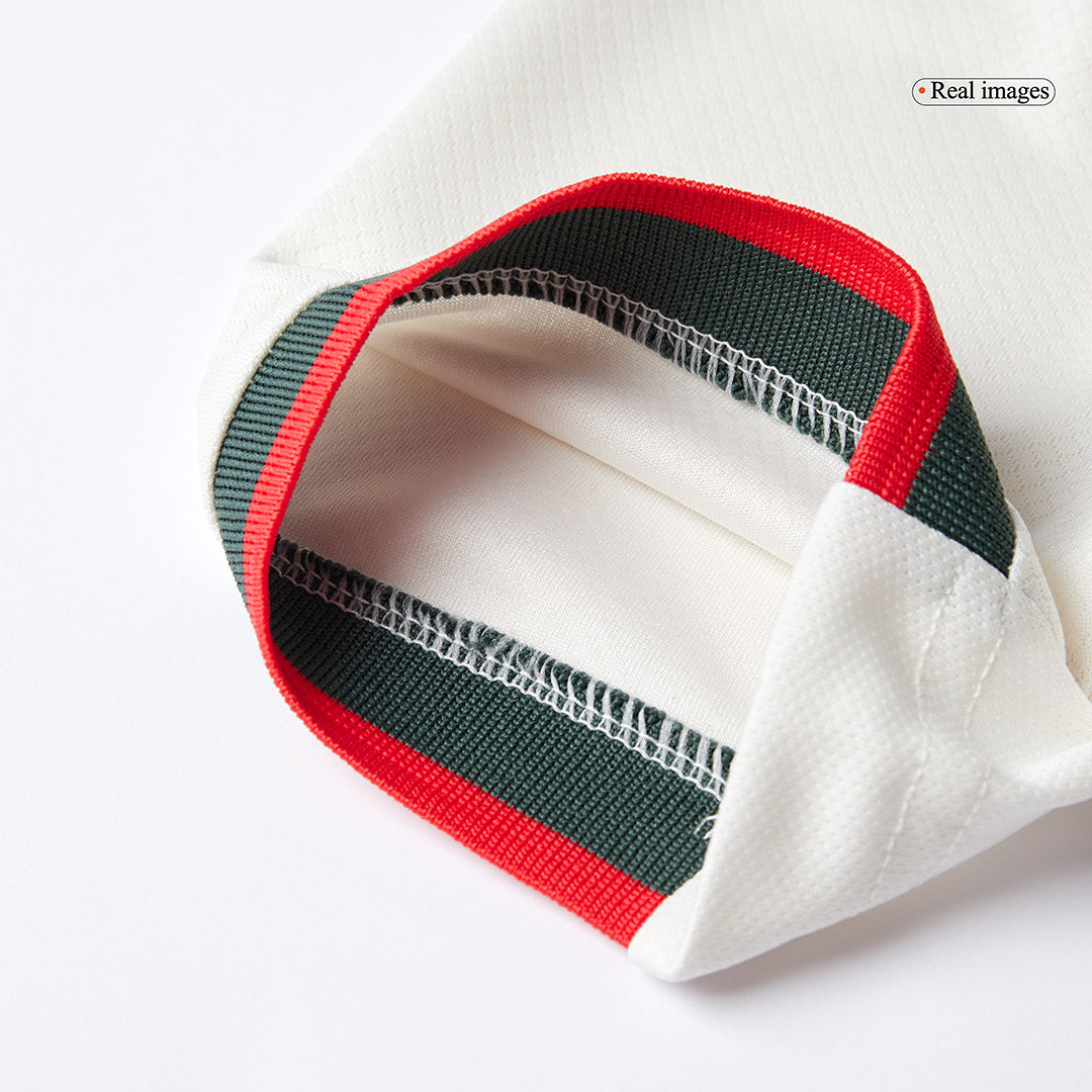 La version "Joueur" est identique à celle portée en match, plus ajustée et technique pour la performance. La version "Supporter" est conçue pour le confort quotidien avec une coupe plus standard. Les écussons sont souvent thermocollés sur la version Joueur et brodés sur la version Supporter pour plus de durabilité.
