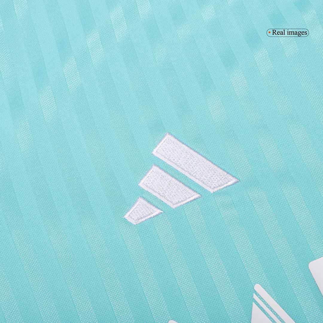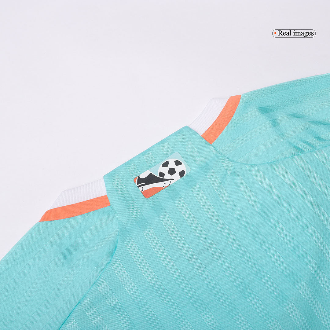 La version "Joueur" est identique à celle portée en match, plus ajustée et technique pour la performance. La version "Supporter" est conçue pour le confort quotidien avec une coupe plus standard. Les écussons sont souvent thermocollés sur la version Joueur et brodés sur la version Supporter pour plus de durabilité.