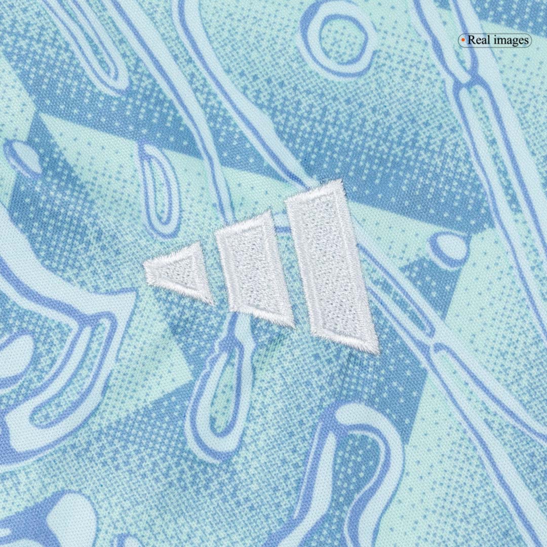 La version "Joueur" est identique à celle portée en match, plus ajustée et technique pour la performance. La version "Supporter" est conçue pour le confort quotidien avec une coupe plus standard. Les écussons sont souvent thermocollés sur la version Joueur et brodés sur la version Supporter pour plus de durabilité.